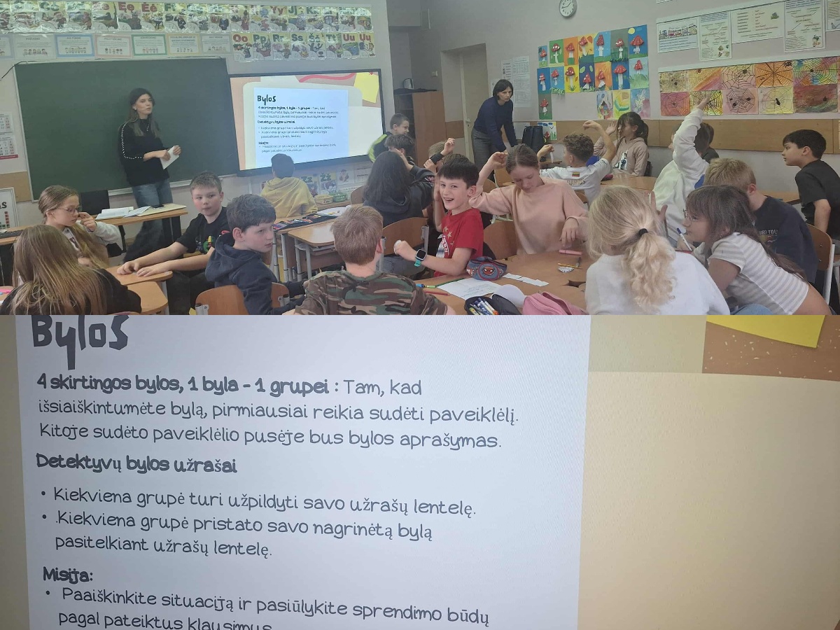 4a klasės mokiniai šiandien tapo Jaunaisiais detektyvais ir sprendė painias gero ir blogo elgesio bylas. Taip aiškinomės apie smurtą, jo rūšis ir tinkamą elgesį. Detektyvams bylas paruošė psichologė praktikantė Orinta Metrikytė.