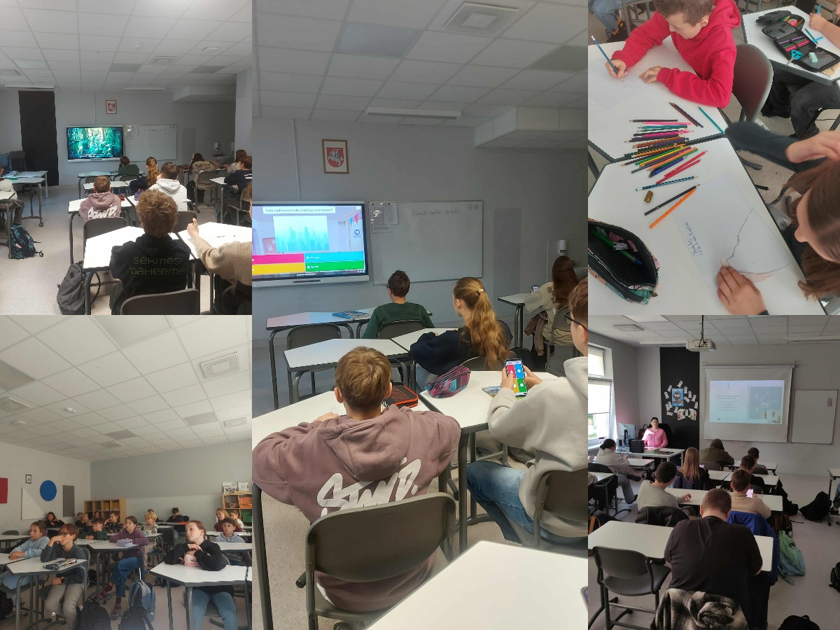 - 5 klasių mokiniai piešė piešinius klimato apsaugos tema, žiūrėjo edukacinius filmus apie klimato kaitą, dirbo grupėse, diskutavo, sprendė interaktyvias užduotis ir ieškojo būdų, kaip kiekvienas iš mūsų gali prisidėti prie klimato kaitos mažinimo.