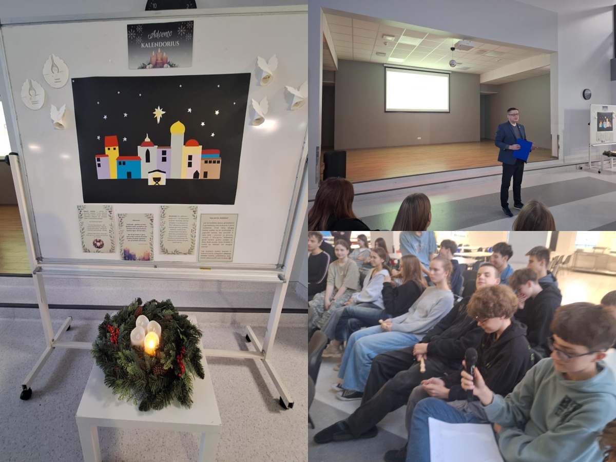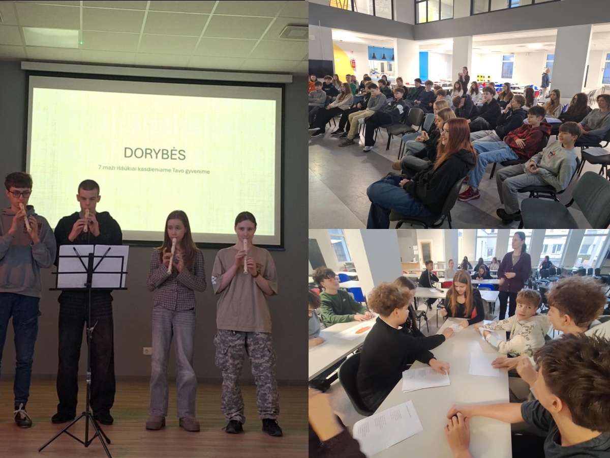 „Prasmingas švenčių laukimas. Dorybės“ – taip vadinosi dorinio ugdymo (etikos ir tikybos) bei muzikos mokytojų organizuotas renginys, skirtas 7–8 klasių mokiniams. Jo metu mokiniai skaitė Bruno Ferrero tekstą „Keturios žvakės“, grojo ir giedojo giesmę, dalyvavo prasminguose pokalbiuose ir veiklose. Labai džiaugiamės, kad užsiėmimus mokiniams vedė Ateitininkų federacijos pirmininkas, gerbiamas Gediminas Plečkaitis. Renginio metu mokiniai ne tik dalyvavo meninėse veiklose, bet ir prisiminė bei giliau suprato dorybių svarbą švenčių laukimo metu. Jie svarstė, kaip šios dorybės gali sušildyti kasdienybę, padėti pastebėti šalia esantį žmogų, kurti geresnius santykius su artimaisiais ir bendruomene. Švenčių laukimas yra ypatingas metas, kai kiekvienas gali stabtelėti, įsiklausyti į save ir kitus, o dorybės tampa tarsi kelrodės žvaigždės, vedančios į prasmingesnį gyvenimą.