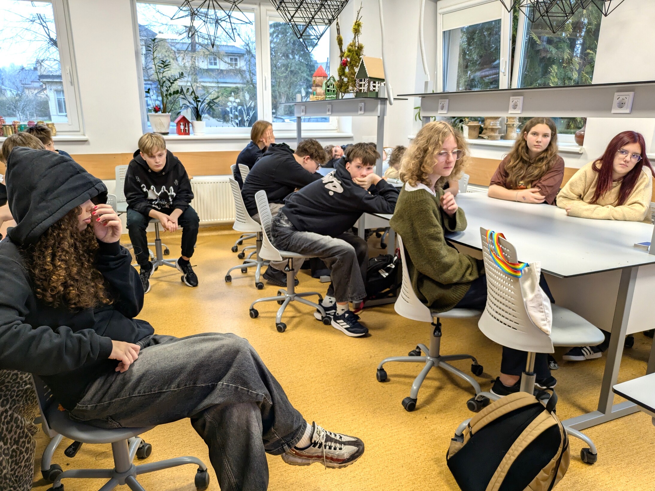 Iš Anykščių atvykęs savanoris ir pagalbos Ukrainai koordinatorius Virginijus Strolia (VšĮ „Laiko skrynia“) mokiniams ir mokytojams papasakojo apie „Pergalės žvakučių“ svarbą, jų panaudojimą bei gamybos technologiją. Jis pademonstravo, kaip kiekvienas iš mūsų gali prisidėti prie jų gamybos. Savanoris atvežė ir perdavė parafino, metalinių dėžučių, lipdukų bei specialiai transportavimui skirtų kartoninių dėžučių. Jas progimnazijos mokiniai papuoš piešiniais ir palinkėjimais – šildys ne tik žvakutės, bet ir vaikų kūryba.